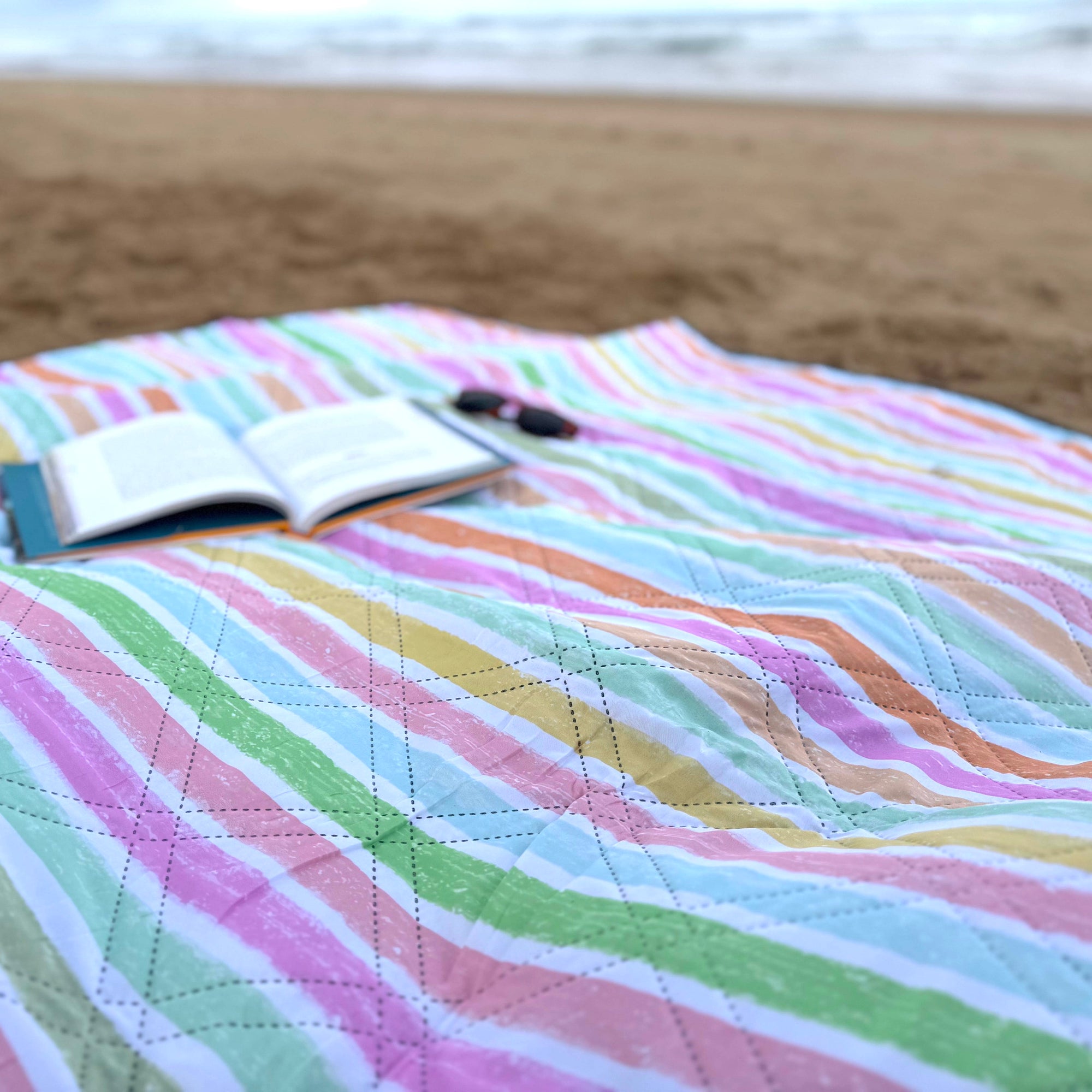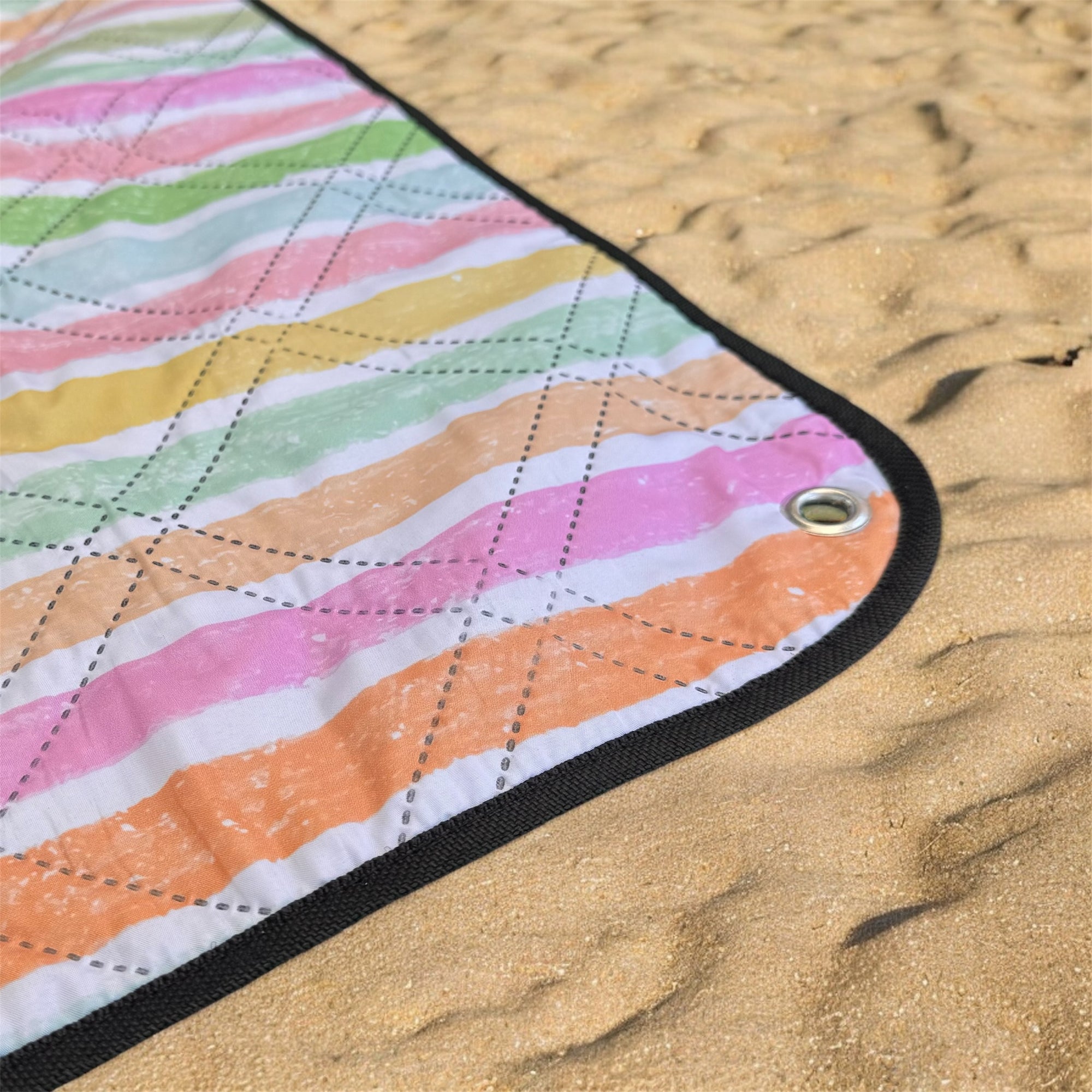 The boho inspired pattern blends beautifully into natural settings — from sandy beaches to grassy parks — making it a versatile choice for picnics, coastal days and slow afternoons outdoors. Its colour naturally shifts in different lighting, asppearing warmer in golden sunlight and slightly more muted in shade, giving it an organic lived in feel that suits real outdoor use.